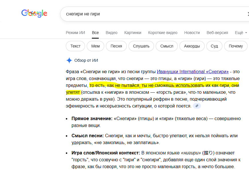 4 tacgnoL Не гири 1 день назад Как же классно жить в эпоху нейросетей! Мультипрофессионал, специалист-генералист во всех областях всегда знает правильный ответ. Вот и сейчас - один запрос, и сразу всё стало кристально ясно Google Нейронные сети 1 Ещё 0