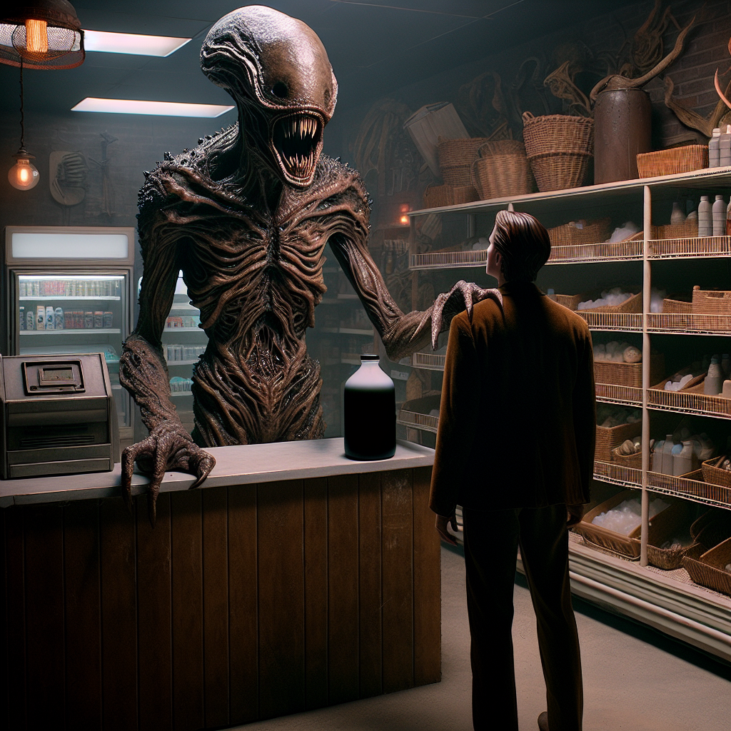 Передо мной стояло нечто ростом не меньше шести футов. Единственные слова, которые могли это описать, – уродливое и чудовищное. Его тёмно-коричневая кожа была гладкой и влажной, с крошечными отверстиями по всей поверхности. На нём не было одежды. Его руки были длинными и тонкими, заканчивающимися похожими на человеческие кистями. Голова была формы большого баскетбольного мяча. Рот существа располагался вертикально, и, когда оно говорило, я видел множество слоёв и рядов зубов, похожих на крокодильи.