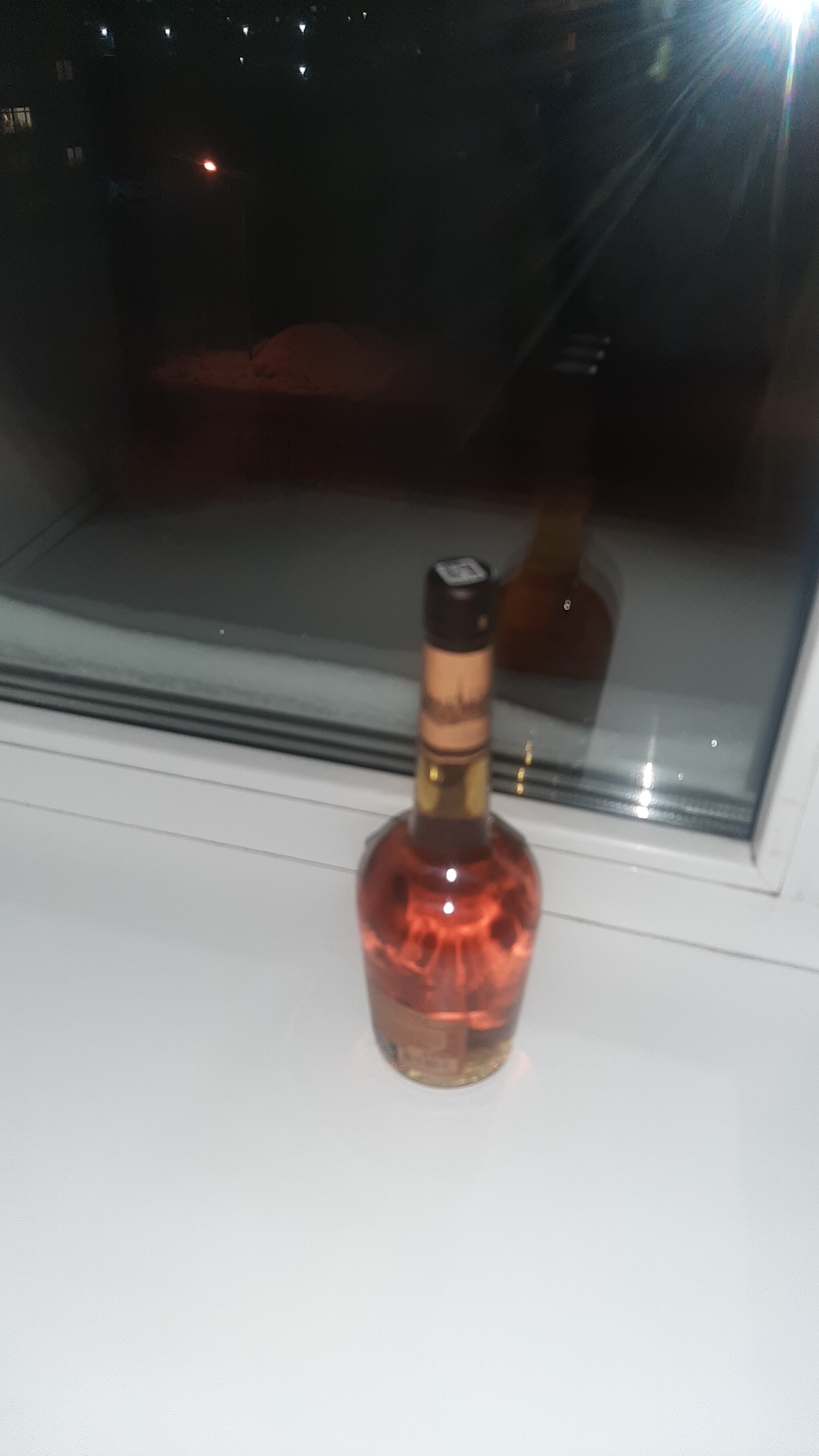 Одинокая бутылочка коньяка потерялась в этом холодном мире, стоит и ждёт, кто же придёт и разделит тепло его души.