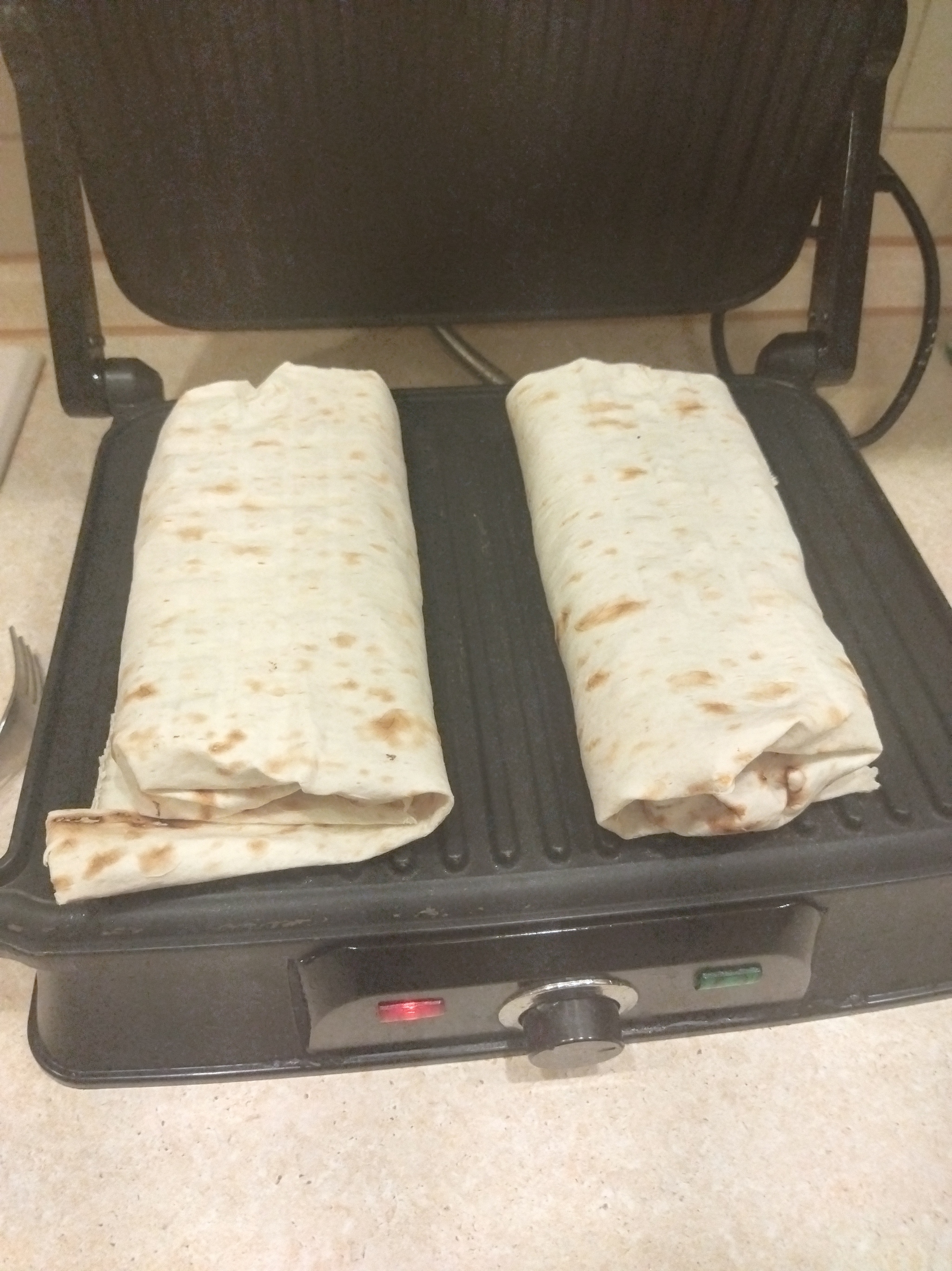 Когда всё приготовили, берем лаваш. На лаваш кладем ложку кетчунеза и размазываем по месту, куда будете выкладывать ингредиенты. На кетчунез кладем нарезанные маслины, сверху сыпем нарезанную курицу и шлифуем все салатом. Аккуратно и плотно заворачиваем и кладем на гриль, чтобы лаваш поджарился и был хрустящим. Если нет гриля, можно использовать сковородку гриль.
