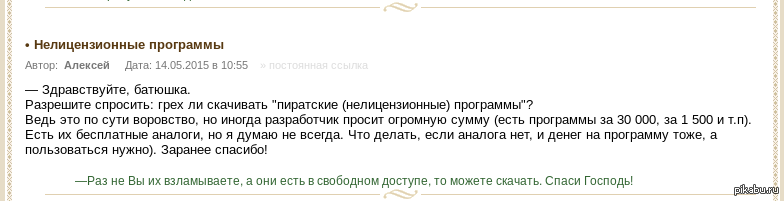 binder 10 лет назад Не лицензионное программное обеспечение (церковь не против). Это и многое другое отсюда -http://hramnagorke.ru/question/ Церковь Программное обеспечение Грех