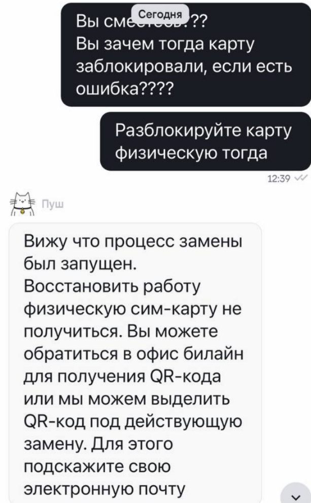В общем, не рекомендую делать замену SIM-карты через приложение, уточняйте у поддержки Билайна, а какой смысл в том, чтобы оставлять людей без связи, при это зная об этой проблеме уже давно(судя по ответам ТП), мы вряд ли узнаем.
