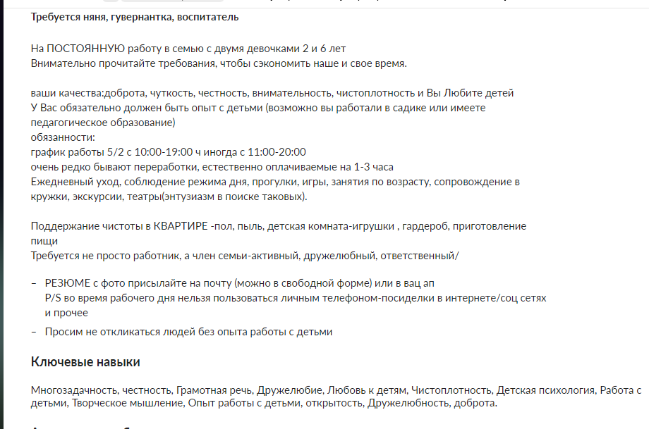4 baruzdina Не многовато ли требований для 35.000? 2 года назад Заниматься детьми, готовить и убирать 9 часов день. Ещё и телефон нельзя пользоваться. Работа Няня Ещё 0