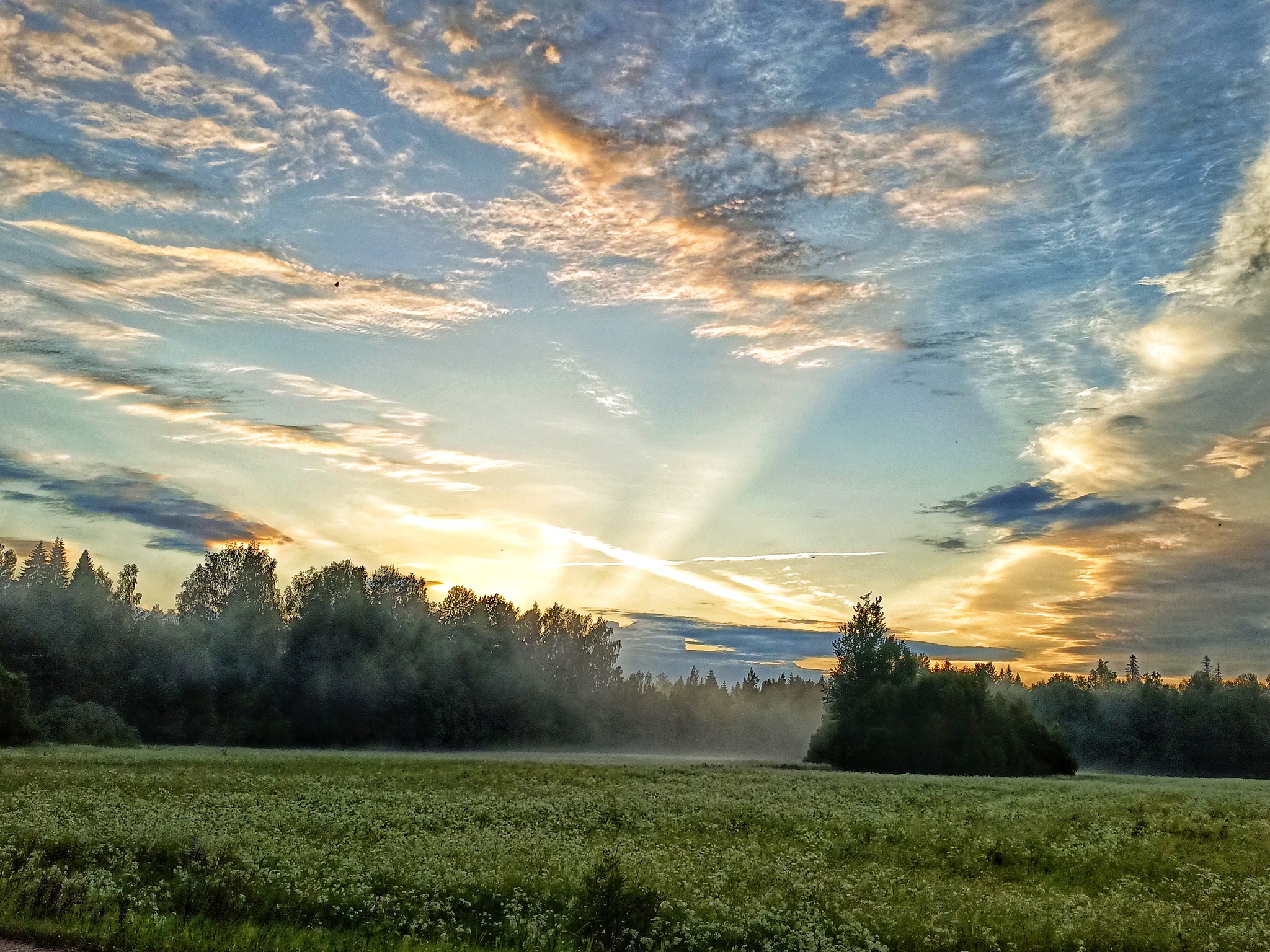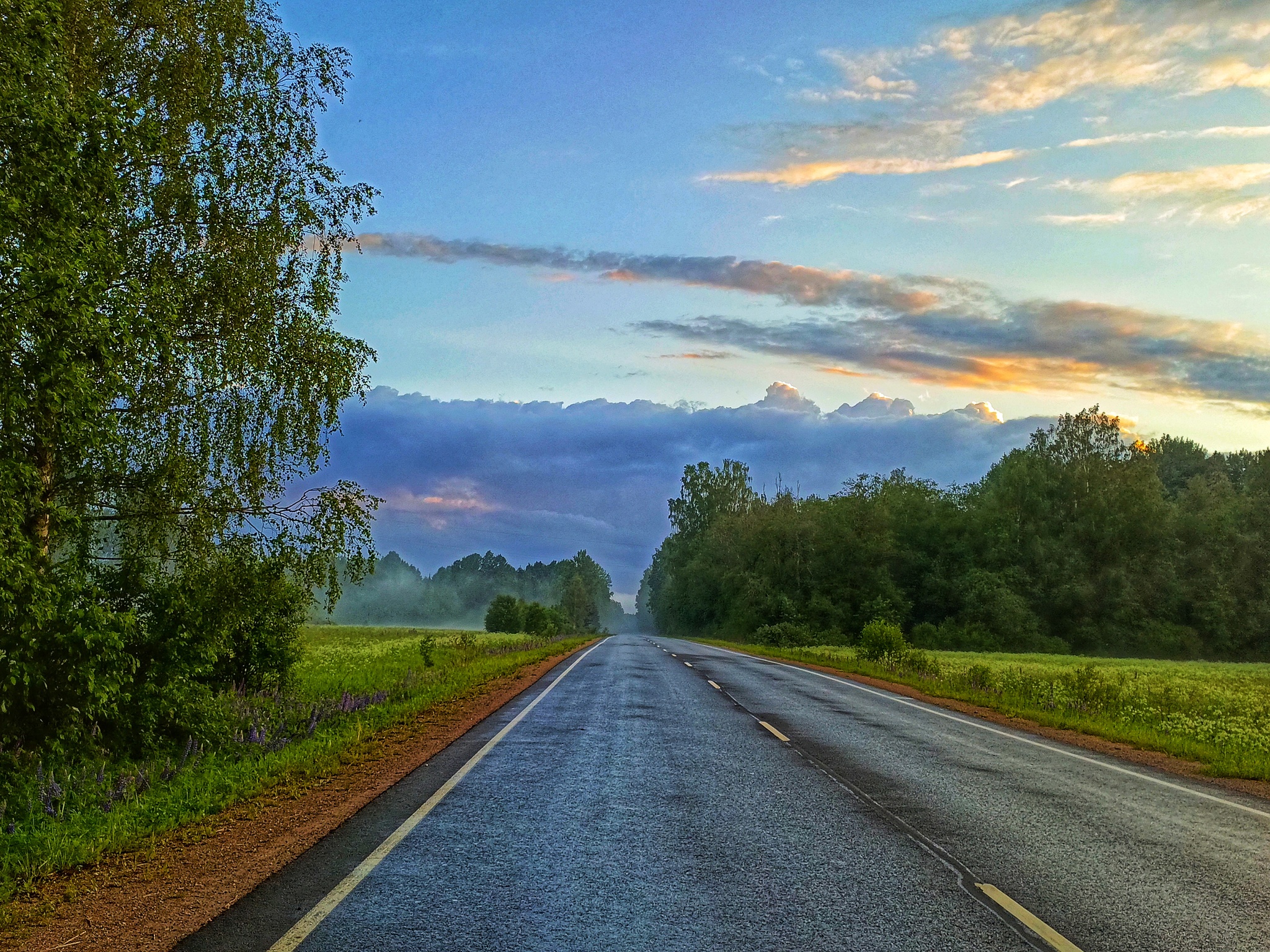 Хочется остановиться на дороге, выйти из машины, а на улице +26. Вокруг пахнет влажной землей, скошенной травой и немножко грозой, которая где-то за линией горизонта еще отдается эхом. В посадках слышится птичье щебетание, а по краю леса - закат пробивается сквозь уходящую тучу. И ты топаешь по обочине, чувствуешь, как промокают ноги от сырой травы, смотришь на этот мир, вдыхаешь его приятный воздух и просто кайфуешь.