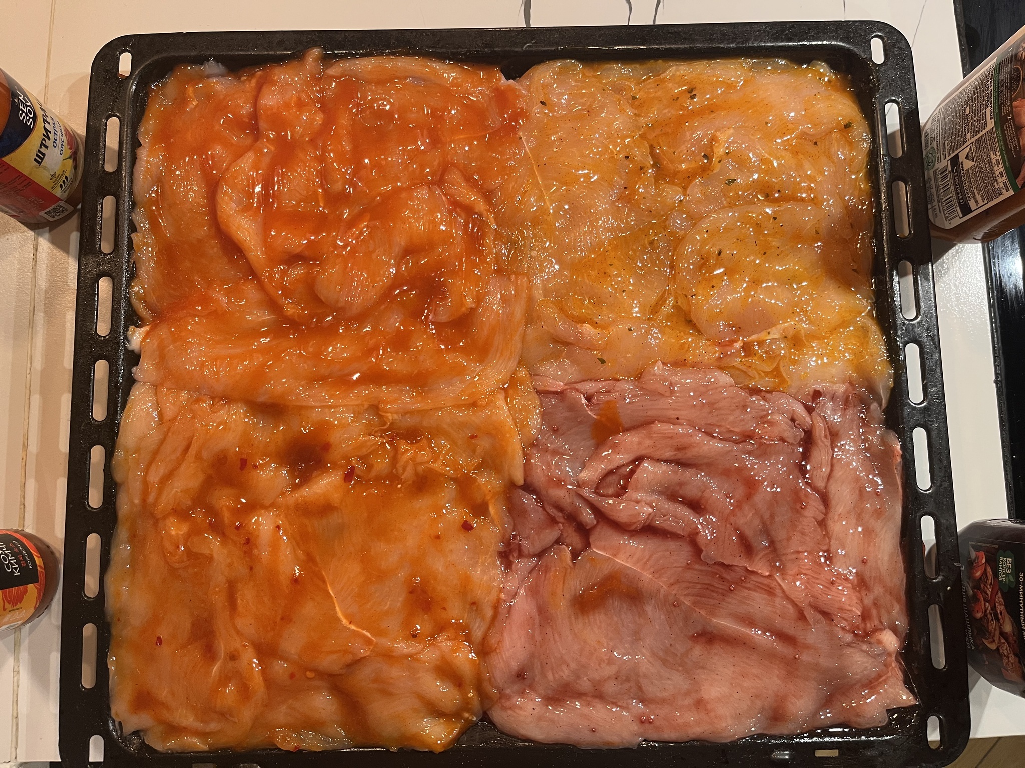 Затем я решил аккуратно раскладывать филе, промазывая соусом каждый слой. Выбрал четыре соуса: ким-чи, шрирача и два маринада, которые еще с лета ждали своей участи в холодильнике. Конечно я был уверен, что не забуду где какой, поэтому нарыл пленкой и не стал делать пометки. По наитию решил, что хватит ночи, чтоб мясо точно просолилось