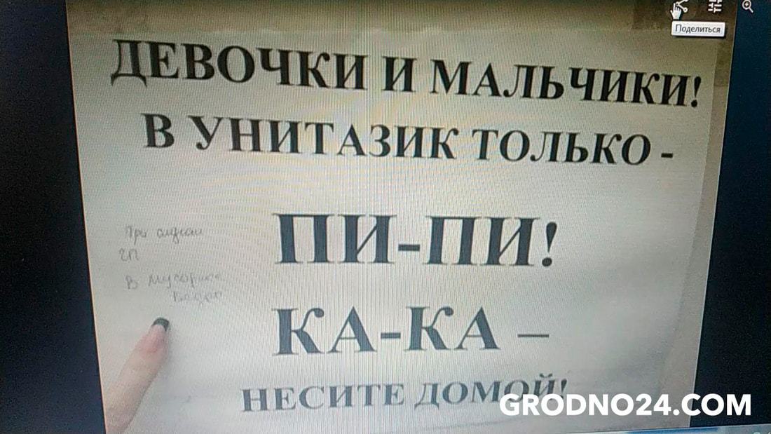 В редакцию областного издания прислали фотографию с красноречивым объявлением для арендаторов площадей в общежитии по проспекту Космонавтов, 41б: «Девочки и мальчики! В унитазик только - ПИ-ПИ! КА-КА — несите домой!» Сразу можно подумать, что это объявление с двери школьного или студенческого туалета. Но, по данным местных журналистов, два этажа этого здания сдаются предпринимателям и юрлицам, а принадлежит и обслуживается оно УЖРЭП Октябрьского района Гродно. И таким образом арендодатель разговаривает с малым бизнесом. С большим, конечно, разговор был бы совсем другой.