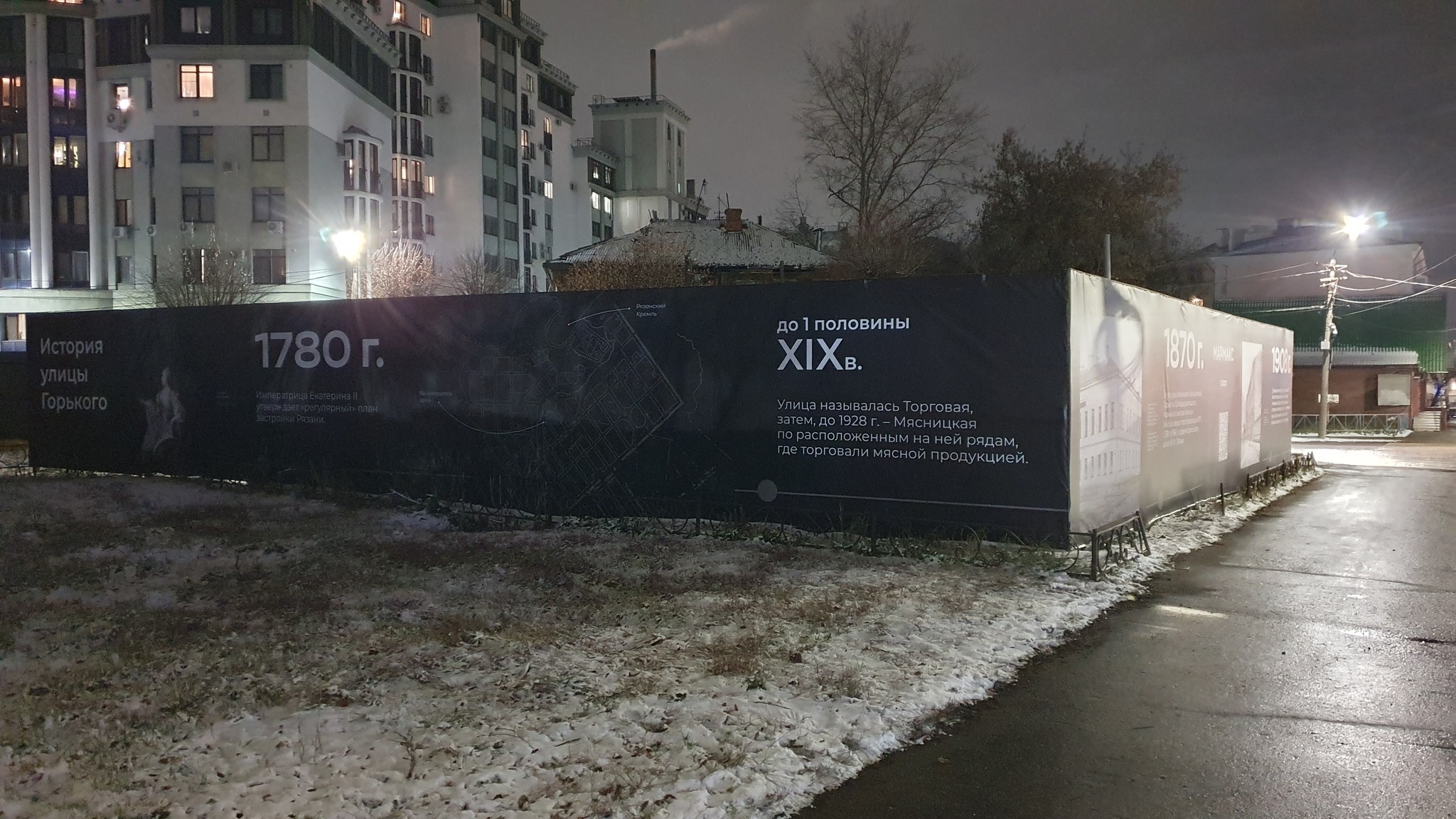 На гигантском баннере от "Мармакс" размещены старинные фотографии строений, а также тексты, рассказывающие историю этих двух улиц. Некоторые объекты, отображённые на трёхметровых фото уже отсутствуют в реале. Последним из показанных на заборе сооружений - здание мавританского стиля (в 25 метрах от баннера!), которое Рязань потеряла в декабре прошлого года.