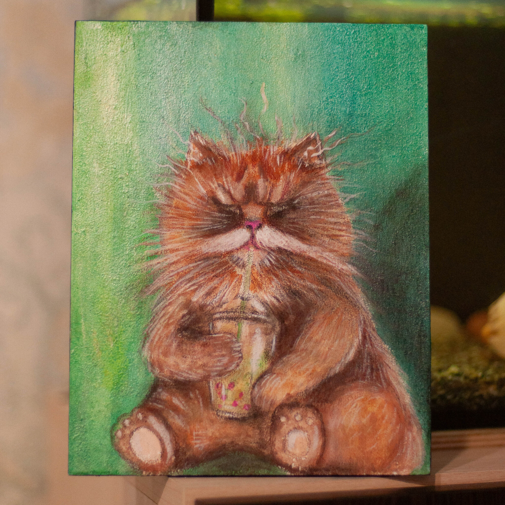 Подумал Grumpy и распушил шерсть, сел на пол и начал пить прохладительные напитки.