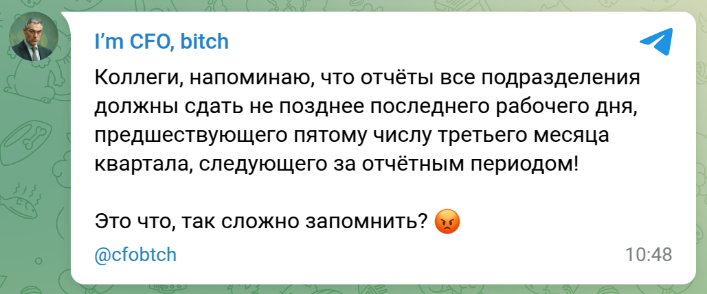 17 imctobitch Норм автор Юмор для всех и каждого Серия I'm CFO, bitch Не позднее пятого числа третьего месяца квартала 7 месяцев назад 🤑 Телеграм-канал [моё] Скриншот Юмор Бюрократия Сложно Директор Финансовый директор Начальство 3 1 Ещё 0