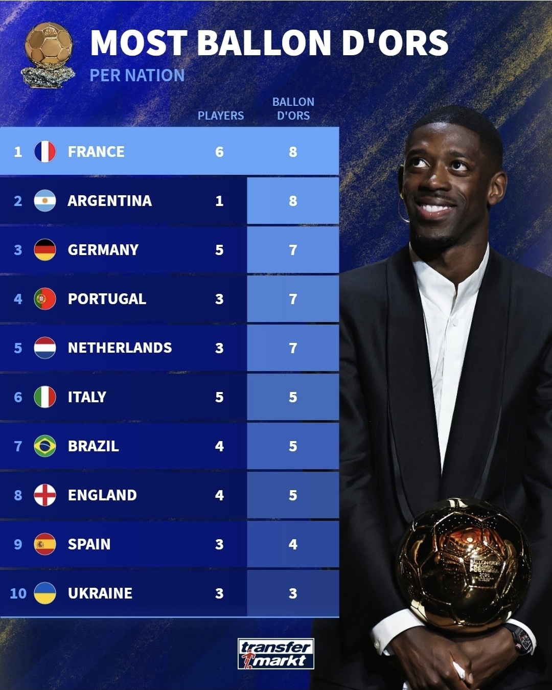 Вчера состоялась церемония награждения лучшего футболиста мира 2025 года. Победил Усман Дембеле из Франции. Следовательно, обновилась статистика по общему количеству золотых мячей (ЗМ) и их обладателей по странам. Ниже представлена картинка от авторитетного ресурса transfermarkt.