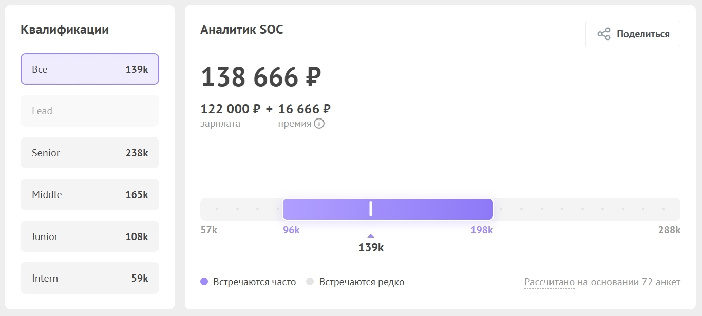 Для L2-аналитика диапазон зарплат большой, так как в разных компаниях требуют разный уровень знаний. Специалист, который работает в этой сфере около года, может рассчитывать на 80–100 тысяч. С опытом два-три года уже можно претендовать на оклад 200 тысяч и больше. От кандидата требуется опыт работы с SIEM-системами и навыки расследования инцидентов.