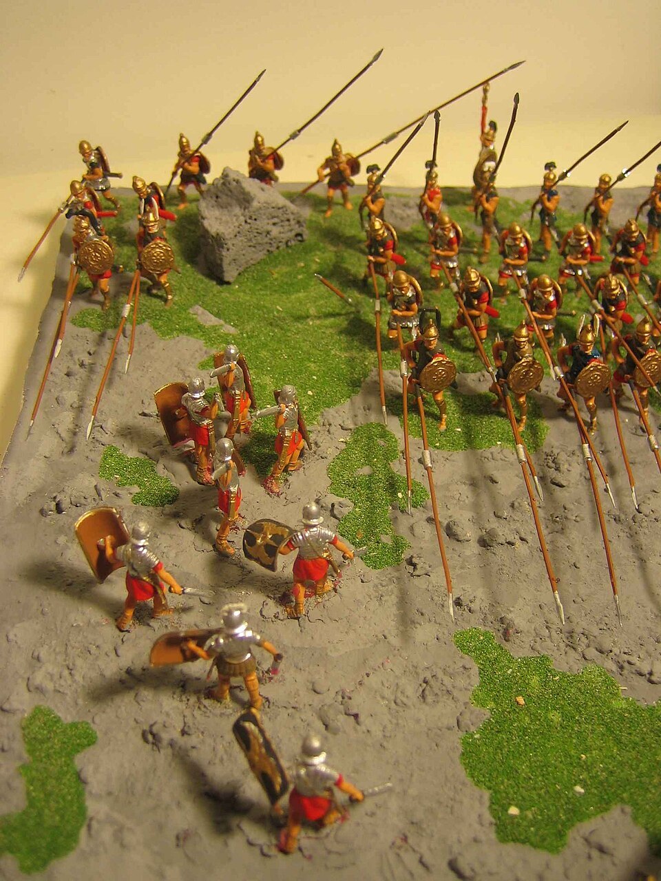 Вот один пример. Шел 168 год до н.э. Третья Македонская война в разгаре. Македонский царь Персей преградил путь римскому войску там, где склоны Олимпа спускаются к видам Эгейского моря. У городка Пидна 22 июня началось сражение. И поначалу римляне были в шоке от того, что такое македонская фаланга. Они столкнулись с лесом копий, с которыми невозможно было бороться. Плутарх рассказывает: