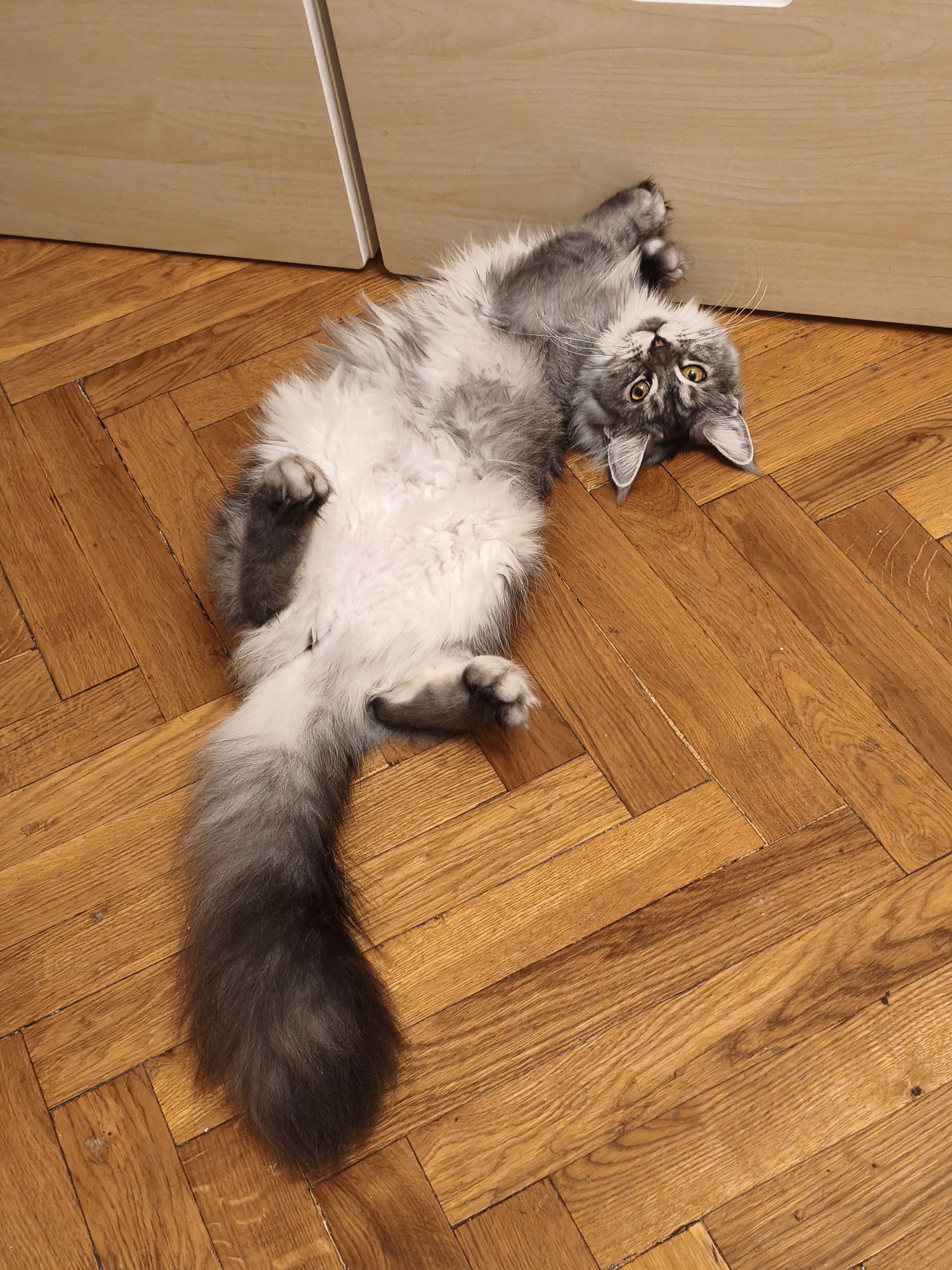 Во общем все устаканилось и в возрасте 9 месяцев котенка весит 5 кило и позволяет себе такие позы