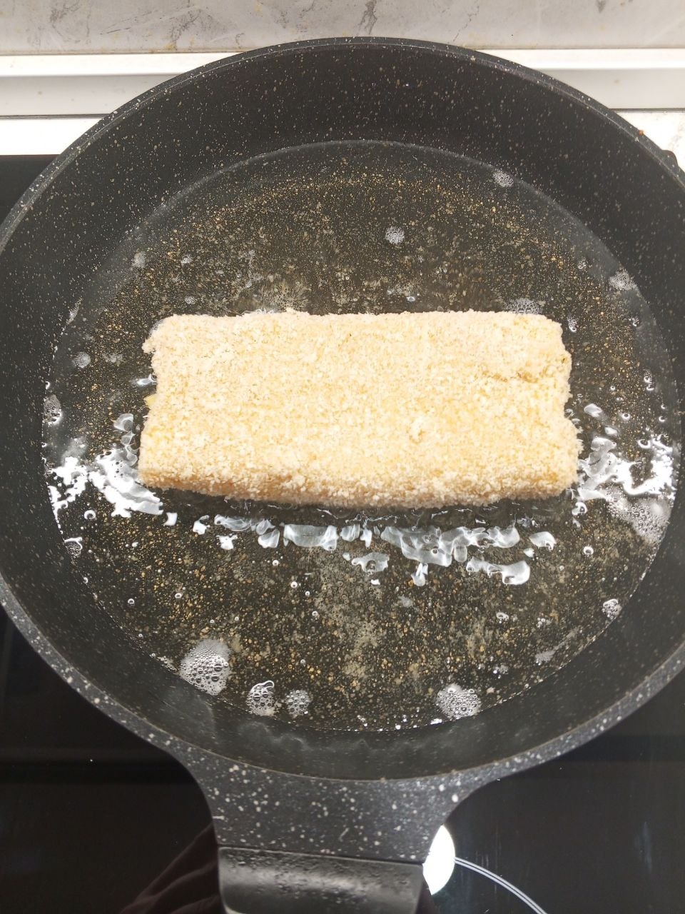 Масло растительное, примерно 2-3см, предварительно разогреть на мощности чуть ниже средней. Можно было и сразу все 3 закинуть, но мне удобнее жарить по 1 штуке