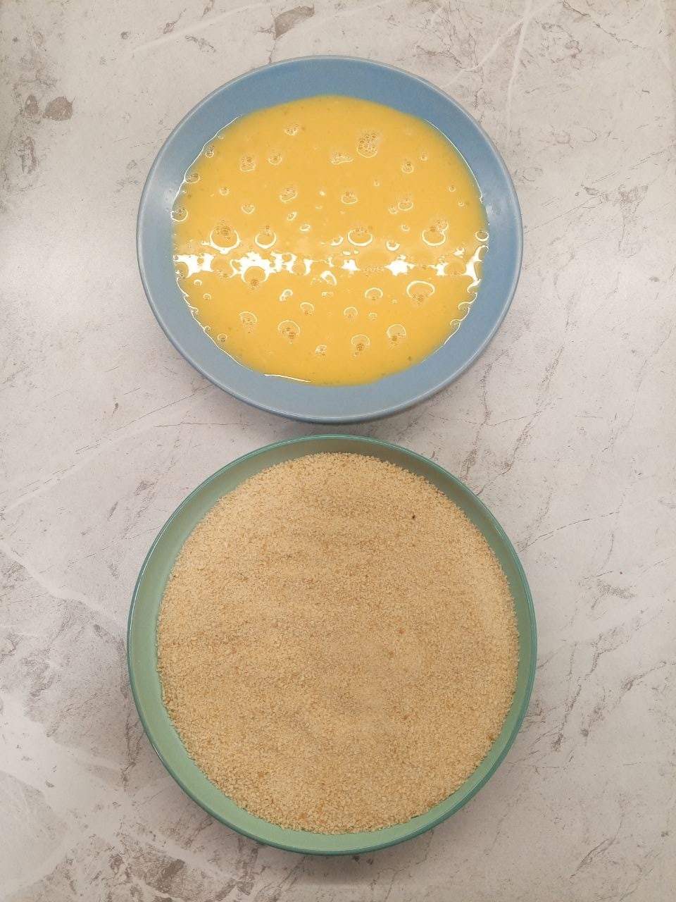 Перемешиваем яички, насыпаем панировочных сухарей: