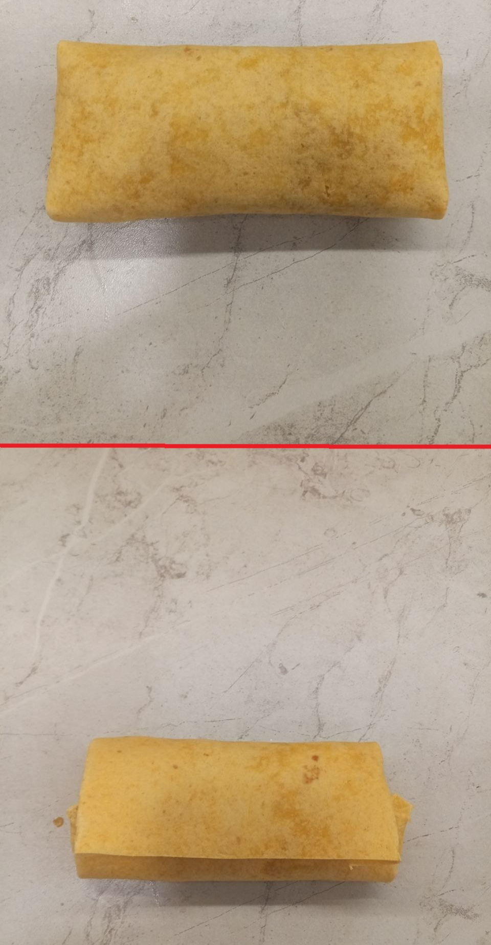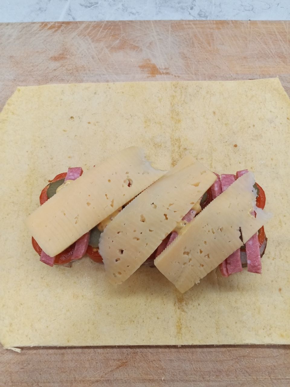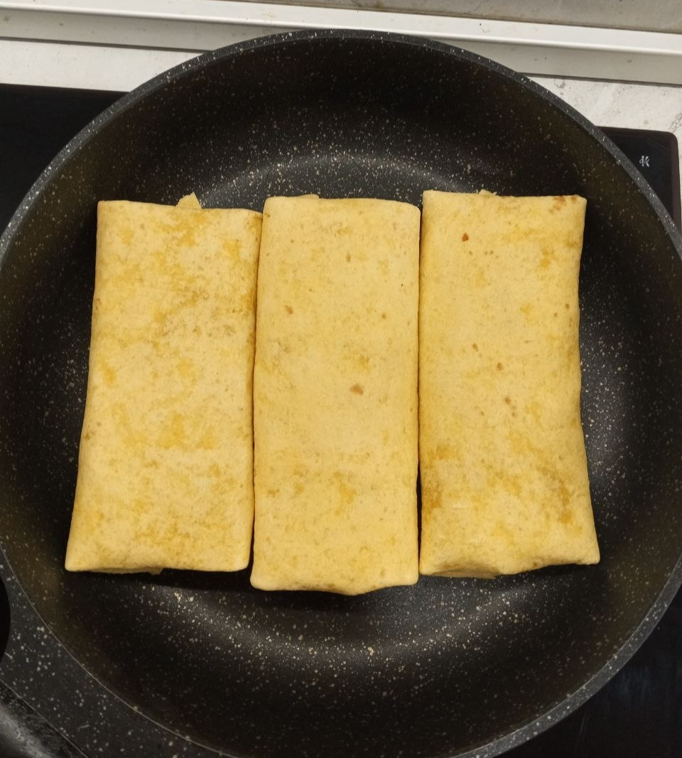 Если не срезать верх и низ, то при сворачивании получится слишком толстый слой тортильи. Можно, конечно, просто положить больше начинки, но я об этом только сейчас подумал(
