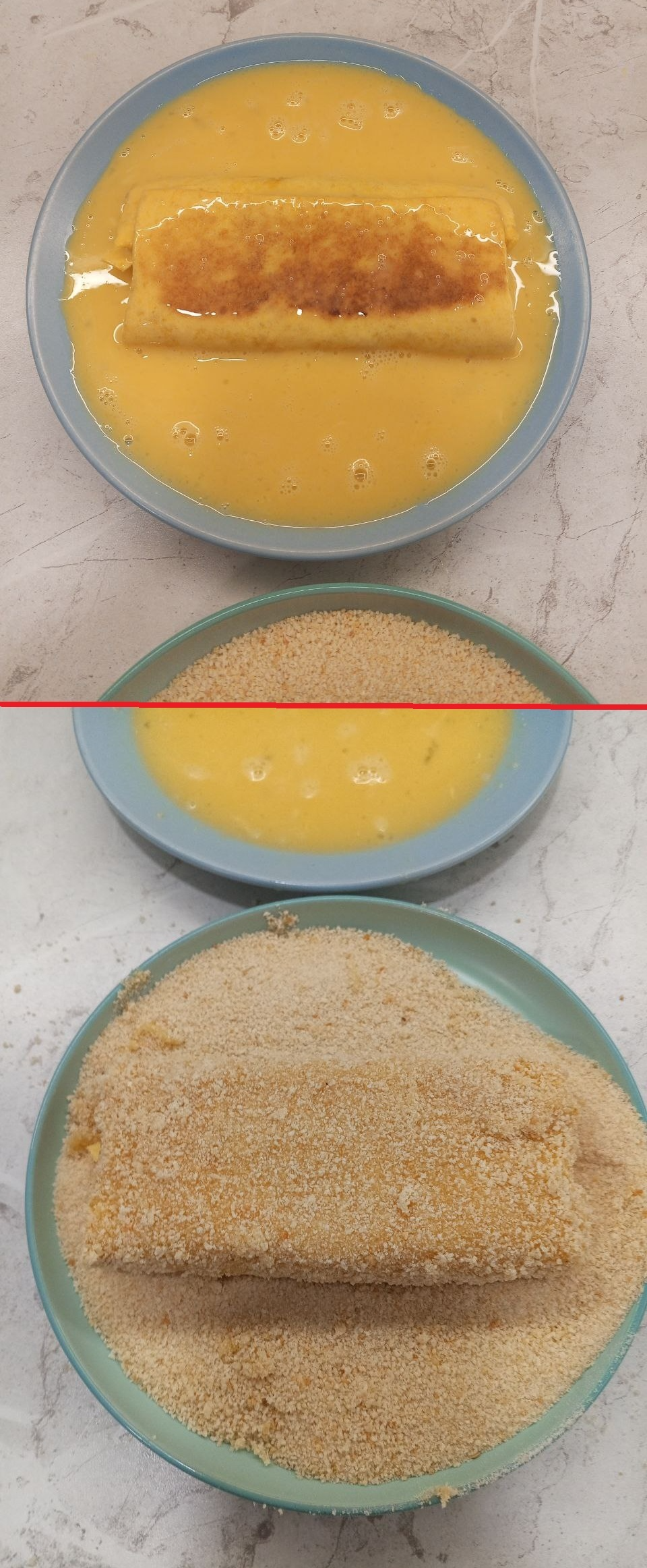 Купаем свёрток еды в яичке, а затем присыпаем панировкой: