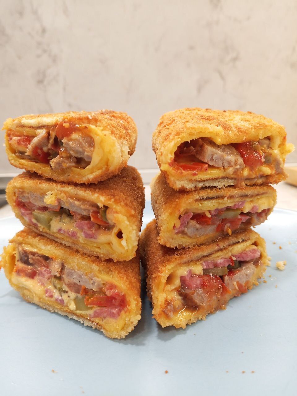 Вкуснее всего получилась с соусом сладкий чили. Я бы добавил гранатовый соус, но он при нагреве становится очень жидким, как вода, и начинает вытекать((
