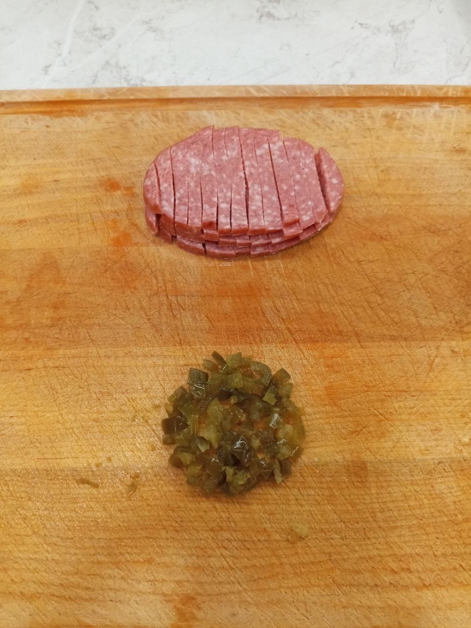 Нарезаем колбасу "соломкой", халапеньо измельчаем: