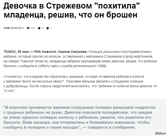 1 FreeMonkey Не стоит оставлять коляску с ребенком на улице) 12 лет назад взято отсюда: http://ria.ru/tomsk/20130629/946532742.html Похищение Новости Стрежевой Девочка Родители
