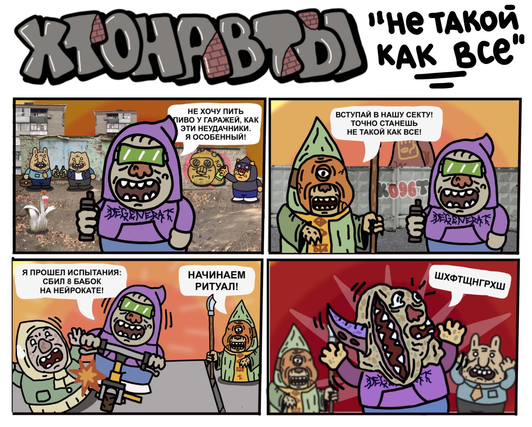 Рисую безбюджетный мультсериал/комикс "Хтонавты" и делаю одноименную видеоигру про антропоморфных зверей, обитателей пост-советского хтонического гетто, вступающих в схватку за родные хрущевки и гаражи с порождениями древнего ужаса из невообразимых миров.