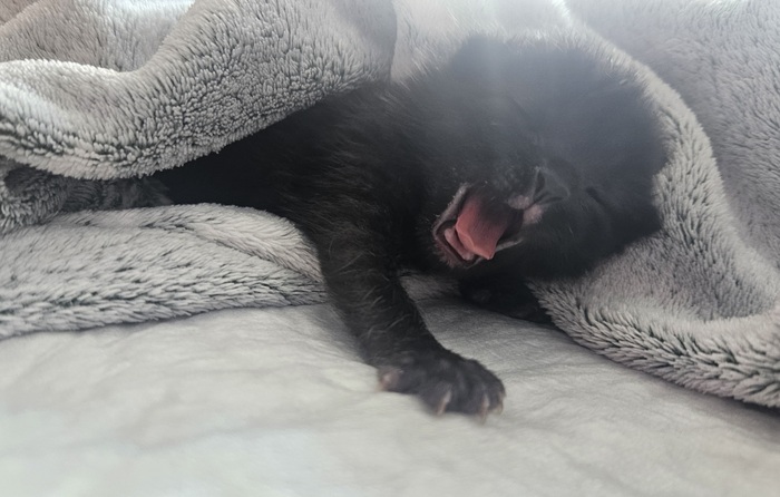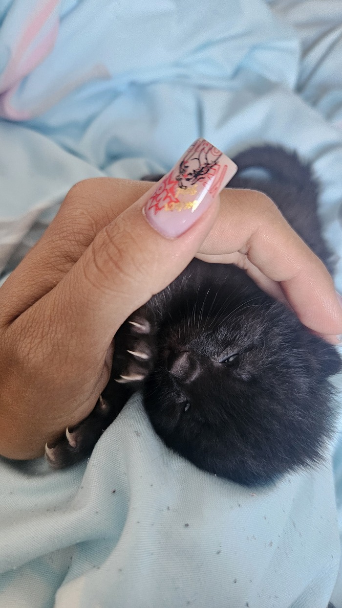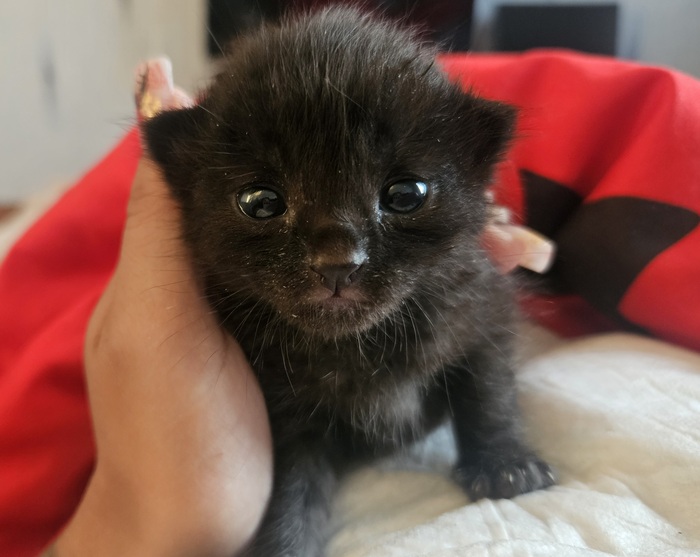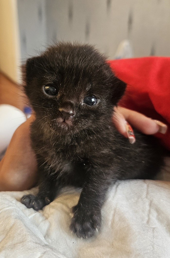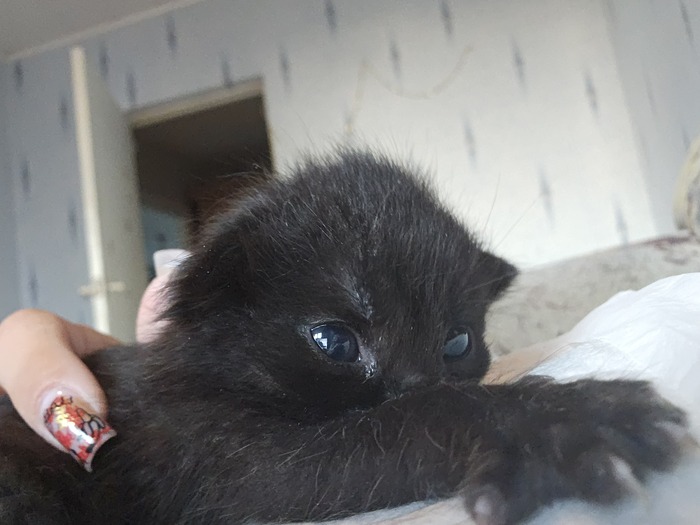 В субботу с утра сходили к ветеринару. Вердикт: кот здоров, чист, скорее всего кто-то выкинул. Возраст - около 2х недель. Вес- 200 грамм.