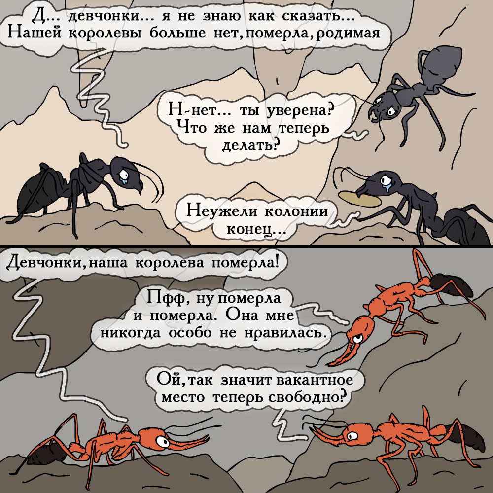 Факт-пояснение: Как правило, смерть королевы это закат существования семьи муравьев. Однако, некоторые муравьи, например как Harpegnathos saltator, имеют возможность заменить королеву с помощью гамергатов - рабочей особи, которая начнёт нести яйца и если выдержит конкуренцию, то займет место погибшей королевы.