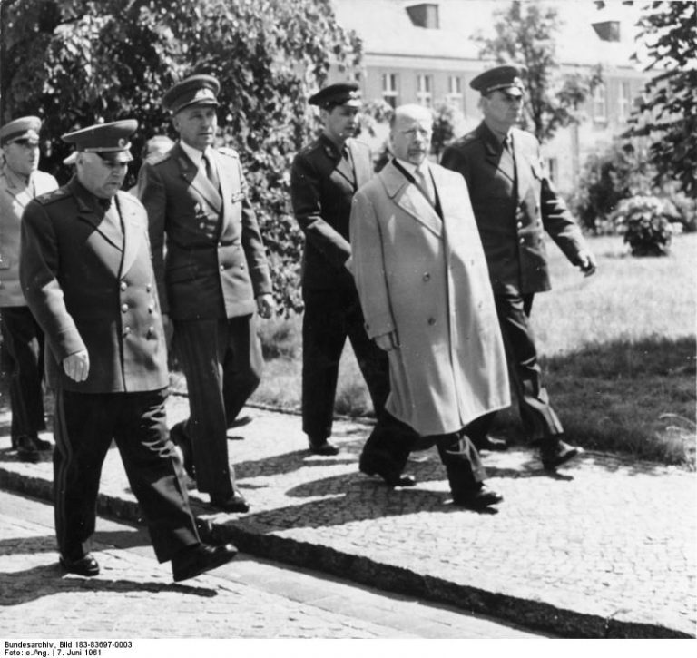 1-й заместитель министра обороны СССР — главнокомандующий Объединёнными ВС государств — участников Варшавского договора А. А. Гречко (справа) с министром обороны СССР Р. Я. Малиновским в ГДР. 1961 год.