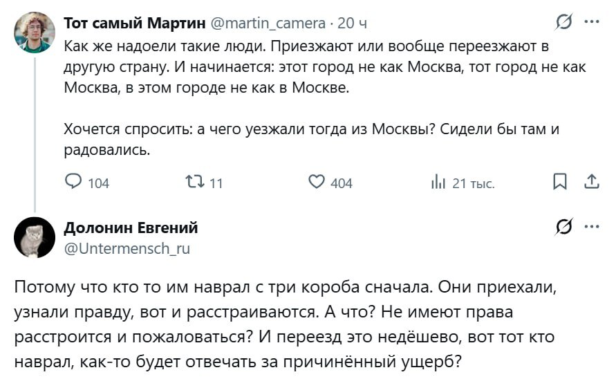 1089 TvoiPasha Не вижу ничего плохого в рефлексии иммигрантов 4 дня назад X (Twitter) Скриншот Иммиграция Двойные стандарты Москва Эмиграция Сравнение Разочарование 234 48 20 5 2 1 Ещё 1
