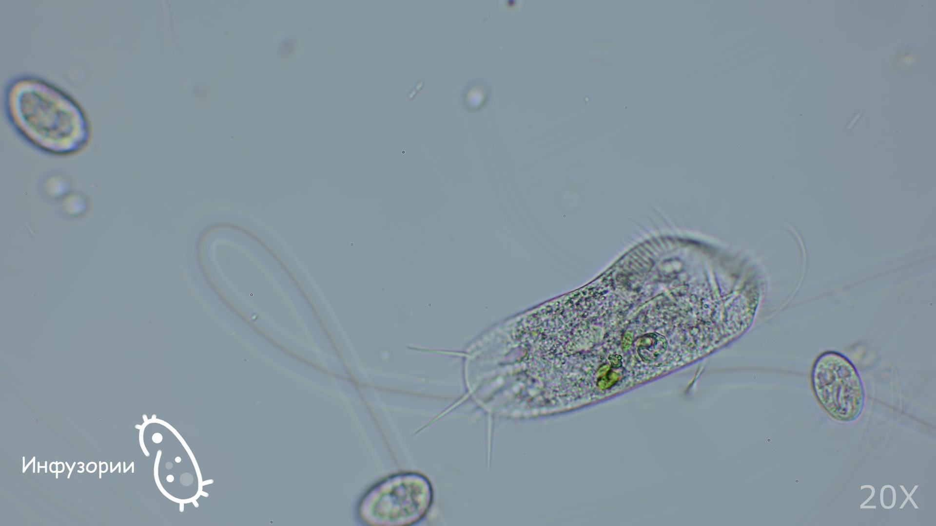 №6 Paramеcium. Вот она, знаменитая волосатая подошва из учебника биологии! В реальности подошва оказалась красивейшим одноклеточны животным. Не знаю, как вас, но меня эти утончённые формы впечатлили. Будто башмачок из матового стекла или тончайшей замши. Туфелька Золушки:) Правда, "ходит" туфелька "пяткой" вперёд:) Заострённый конец - задний.