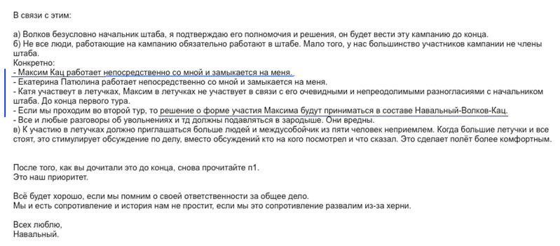 Максим Кац выложил свидетельства очевидцев и переписку с Навальным того времени. Из нее следовало, что между Кацем и ближайшим соратником Навального Волковым разгорелся конфликт из-за сотрудницы штаба Патюлиной. В связи с этим Волков стремился уволить Каца. Также из переписки следовало, что Навальный солгал, когда говорил об увольнении Каца за две недели до выборов.