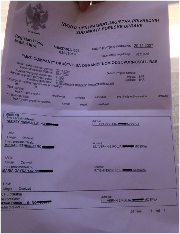 Налоговая служба Черногории официально подтвердила, что Навальный является соучредителем компании в Черногории. В подтверждение данного факта позднее была предъявлена выписка из черногорского реестра юридических лиц.