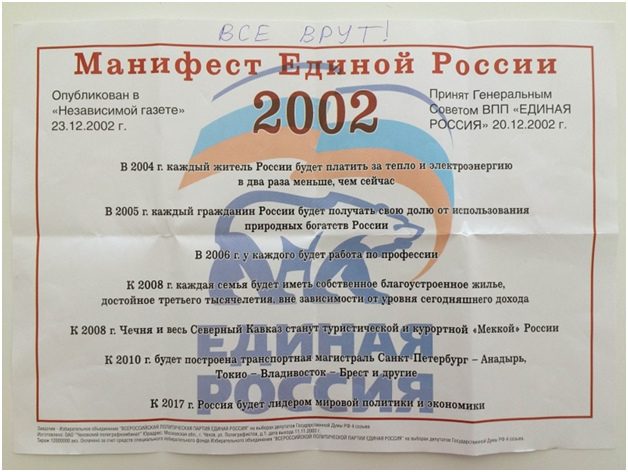 По мнению Навального, в 2002 году «Единая Россия» приняла манифест, в котором населению были розданы столь щедрые обещания, которые не были выполнены.