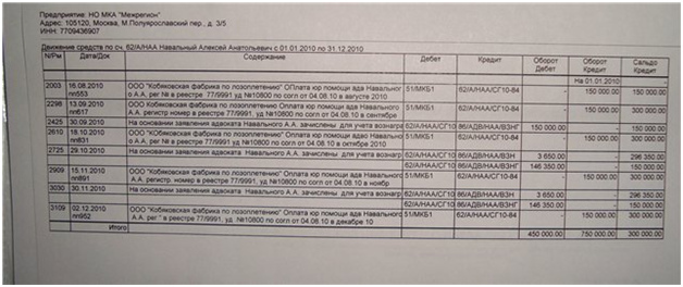 На данный момент неизвестно ни об одном клиенте адвоката Навального, за исключением Кобяковской фабрики лозоплетения его родителей, которая была в 2010 году единственным источником его доходов.