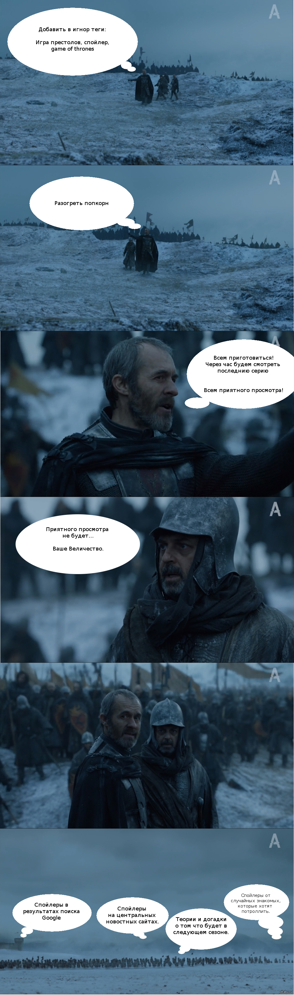 159 markvinsent 10 лет назад Не все смогли избежать спойлеров. В продолжении поста - http://pikabu.ru/story/_3420381 Игра престолов Спойлер Спойлеры они везде Game of thrones Длиннопост