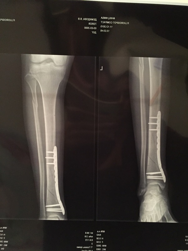 Я отдыхала дома с гипсом на ноге,надеясь что скоро его снимут. Через 3 недели после травмы я поехала в больницу на рентген,при получении снимка я,естественно,сразу посмотрела на него.Моему удивлению не было предела,когда я увидела тоже самое что и в день падения только смещение больше.Теша себя надеждой что "все так и должно быть" пошла к травматологу,который отправил нас к заведующему отделению со словами "я думаю,что нужна операция,но заведующий знает лучше,что делать".Мы поднялись наверх,зашли в кабинет.Я отдала снимки доктору,он подняв их напротив лампы однозначно сказал "операция",на доли секунды в кабинете затаилась тишина,как он снова продолжил "Место перелома,слишком низкое-нижняя треть голени,кровоснабжение в этом месте в организме самое маленькое,с гипсом сращиваться кость будет год,если не больше,а с пластиной/штифтом 3 месяца.На госпитализацию".Мало того,что мне сделают операцию,так я ещё 3 недели с гипсом в пустую ходила.Наверное,все что не делается все к лучшему.