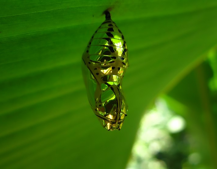 Осталось разобраться, зачем же вся это красота самим куколкам? Дело в том, что стадия куколки у насекомых очень уязвима из-за своей неподвижности, так что главная задача золотого блеска – защита. Согласно этой, защитной, гипотезе, сверкающие покровы куколки маскируют её, отражая окружающие предметы и делая её похожей на висящую на побеге растения каплю воды.