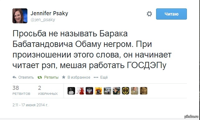 13 IceHeart Не забывай свои корни... 11 лет назад Знаю, что фейк, но смешной же! Барак Обама Джен Псаки X (Twitter)