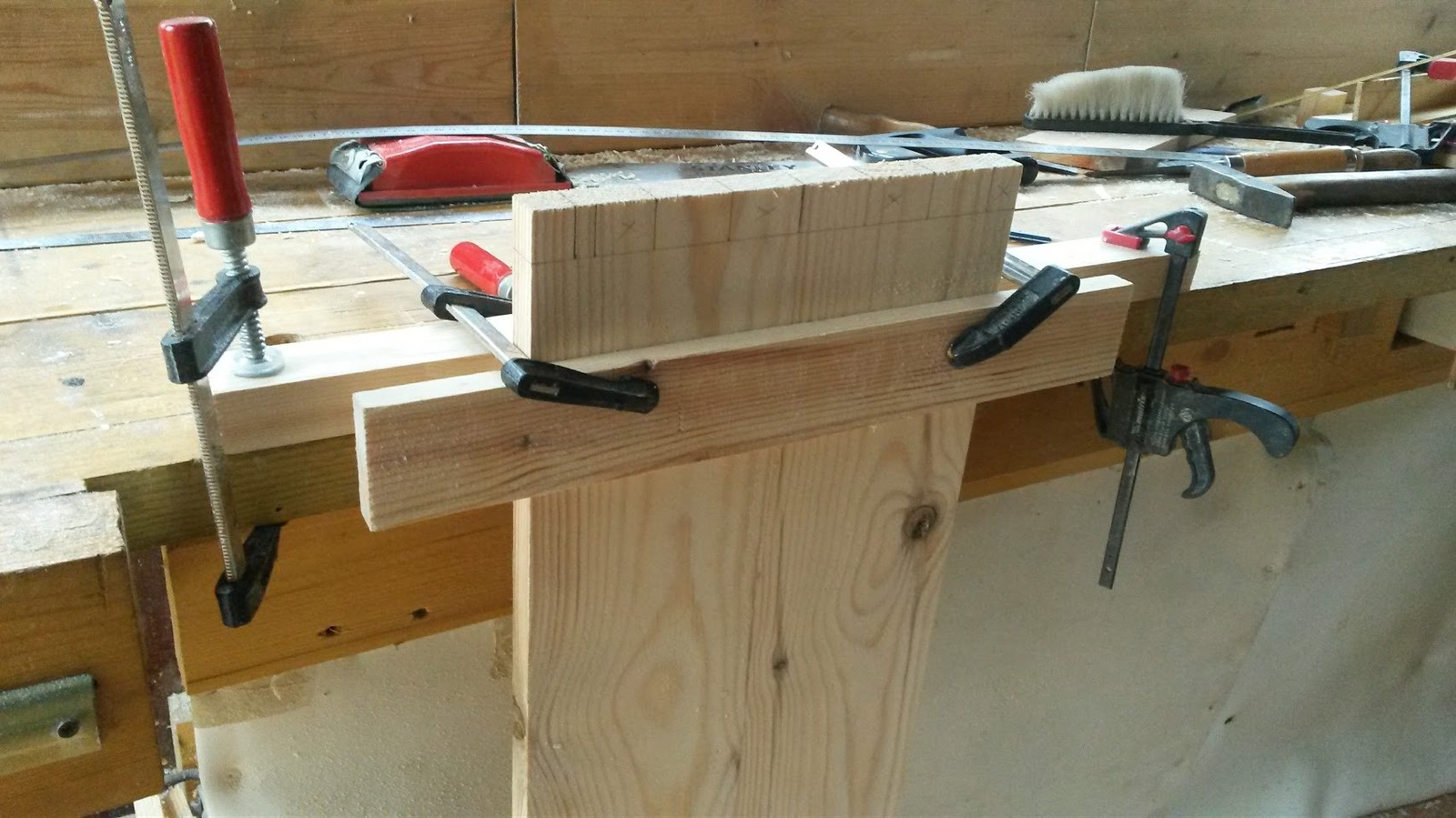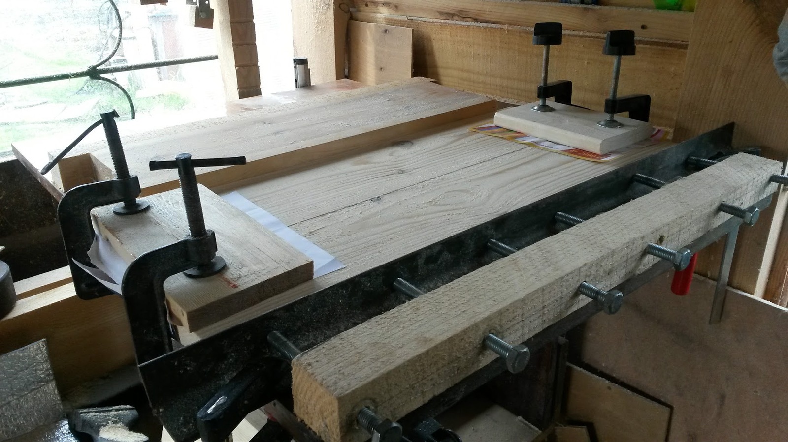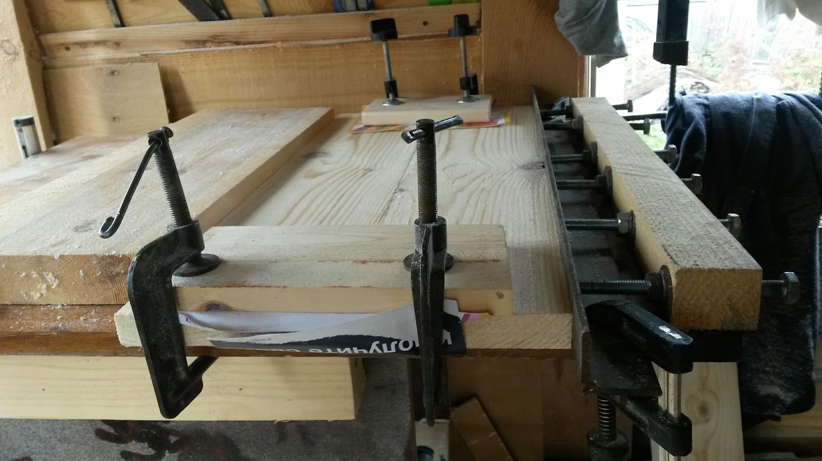 Клею щиты. Первоначально использовал клей ПВА Столяр D-3, но при положительных температурах чуть выше нуля он работать отказался. Пришлось выдавливать остатки PUR-501 которые уже хотел выбросить. И о чудо. Он клеит!