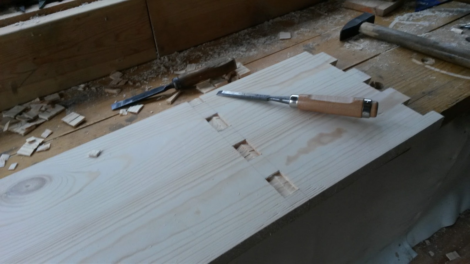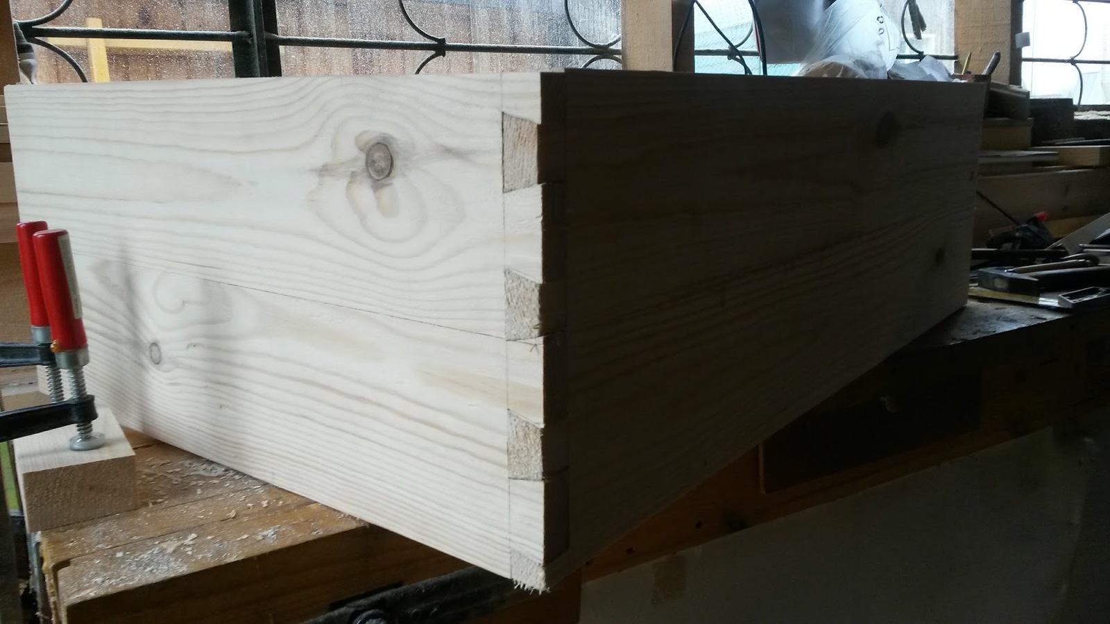 Низ боковых стенок собираю на "ласточкин хвост" сделанный ножовкой и стамеской., низ центральной стенки и ее соединение с сиденьем выдолбленный стамеской шип-паз. Верхняя полка и сиденье к боковым стенкам собраны на закрытый шип паз сделанный фрезером.
