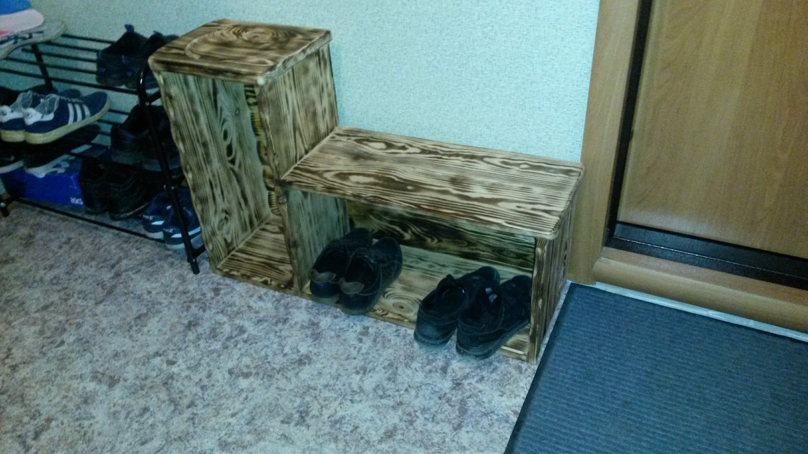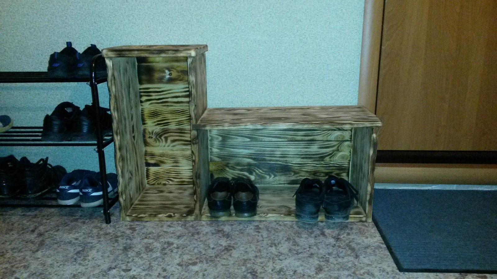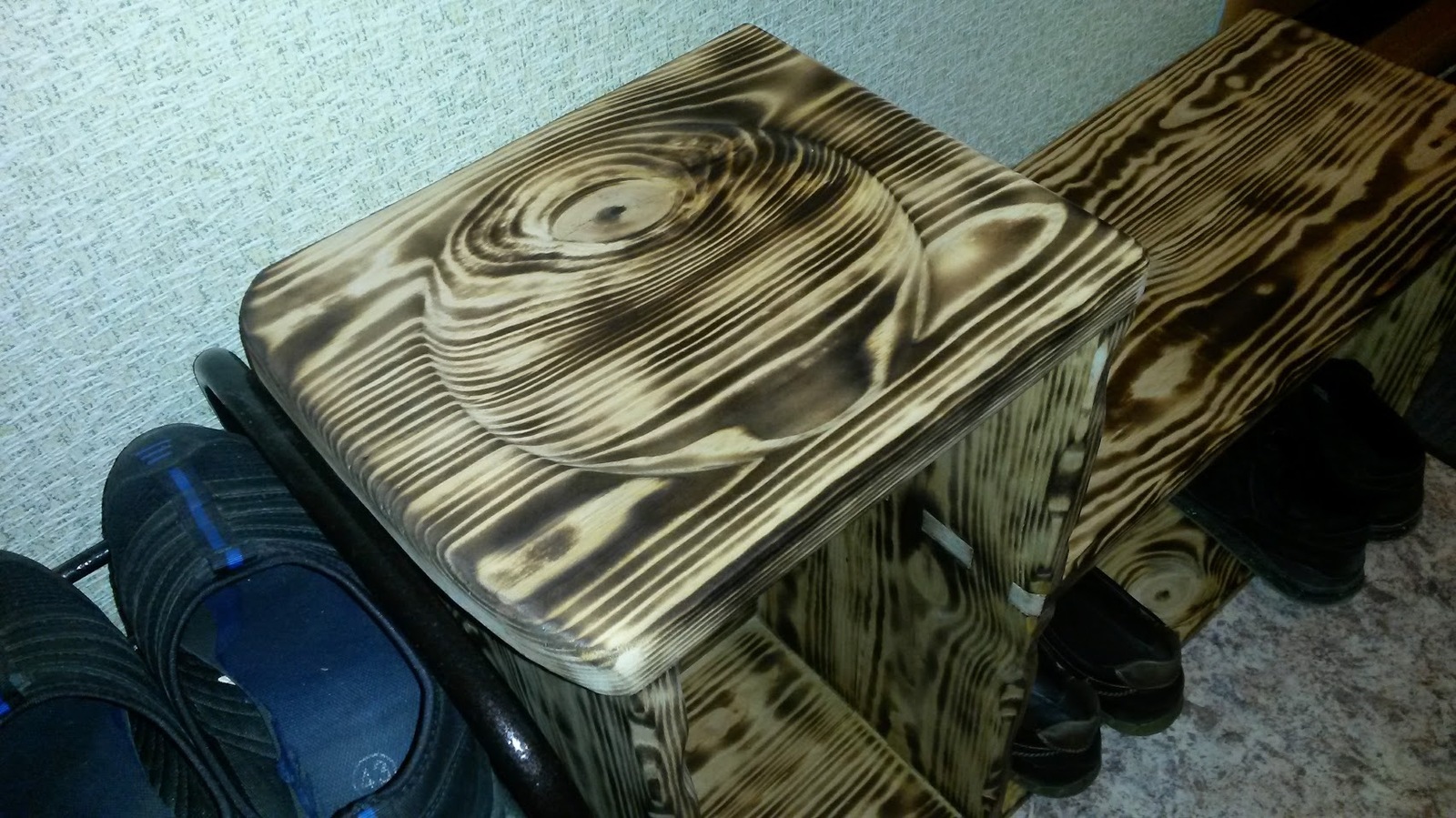 Начал этот эксперимент примерно 3 недели назад, на улице уже было холодно и сыро, периодически накрапывал дождь, температура была около 0, а отпуск заканчивался. "Столярку" на даче пора было уже закрывать на замок до следующего лета, но хотелось еще постолярничать. Решил на эксперимент, а именно сборка обувной полки на соединениях шип-паз, ласточкин хвост без клея из недавно напиленных досках (т.е. фактически сырых) ну и попробовать браширование.