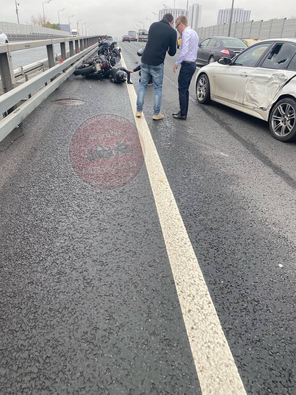 Водитель BMW не заметил мотоцикл и допустил столкновение при перестроении в левый ряд.