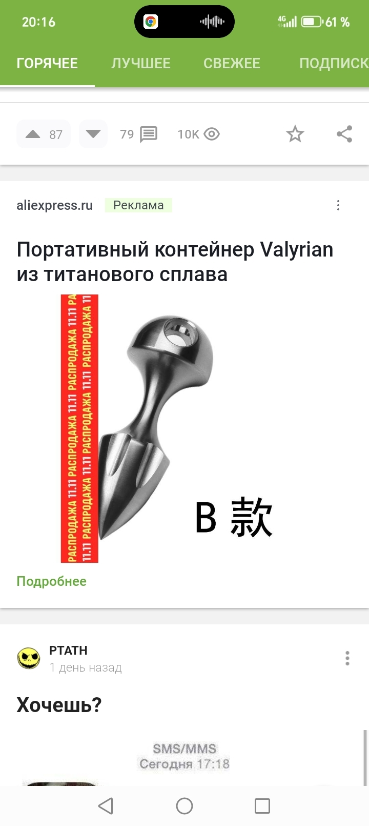1 nemnogogo Не знаю 2 месяца назад Возможно, я не знаю что то о жене, либо реклама али экспресса поехала. Можно мне какую нибудь рекламу окромя кантейнеров с банальной пробкой и вызова демона [моё] Реклама AliExpress Длиннопост Ещё 0