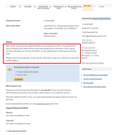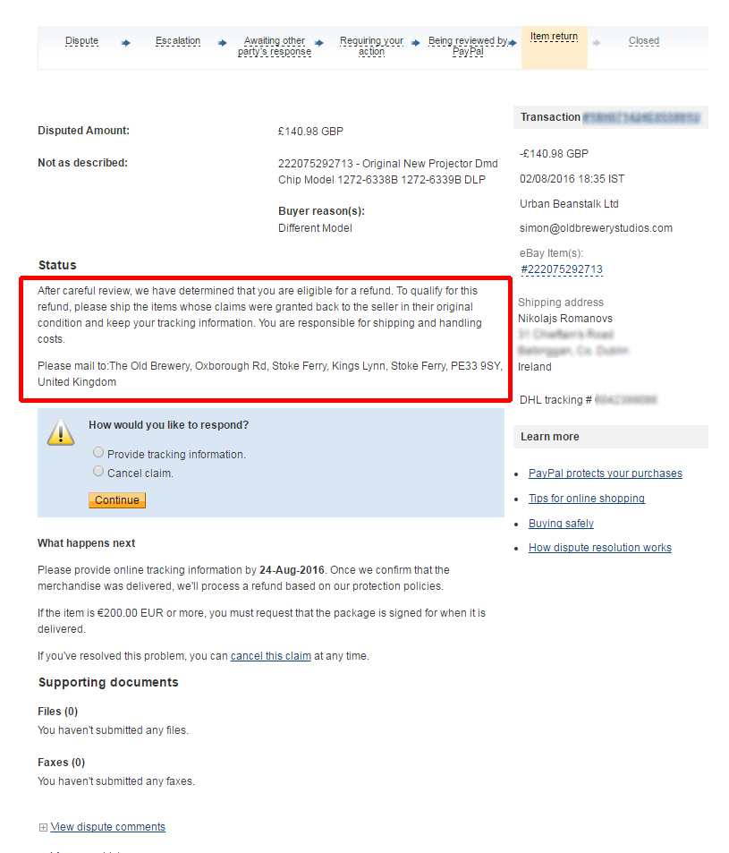 Ошибся в том, что заказал с ebay.ie (живу в Ирландии). В свою очередь ebay.com отказался браться за спор, если заказ был сделан не на .сом