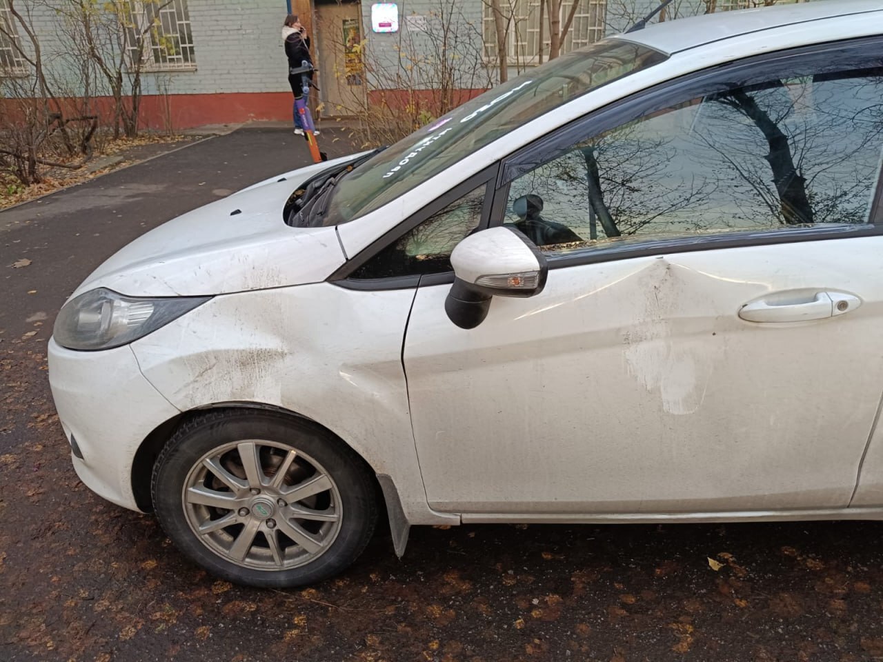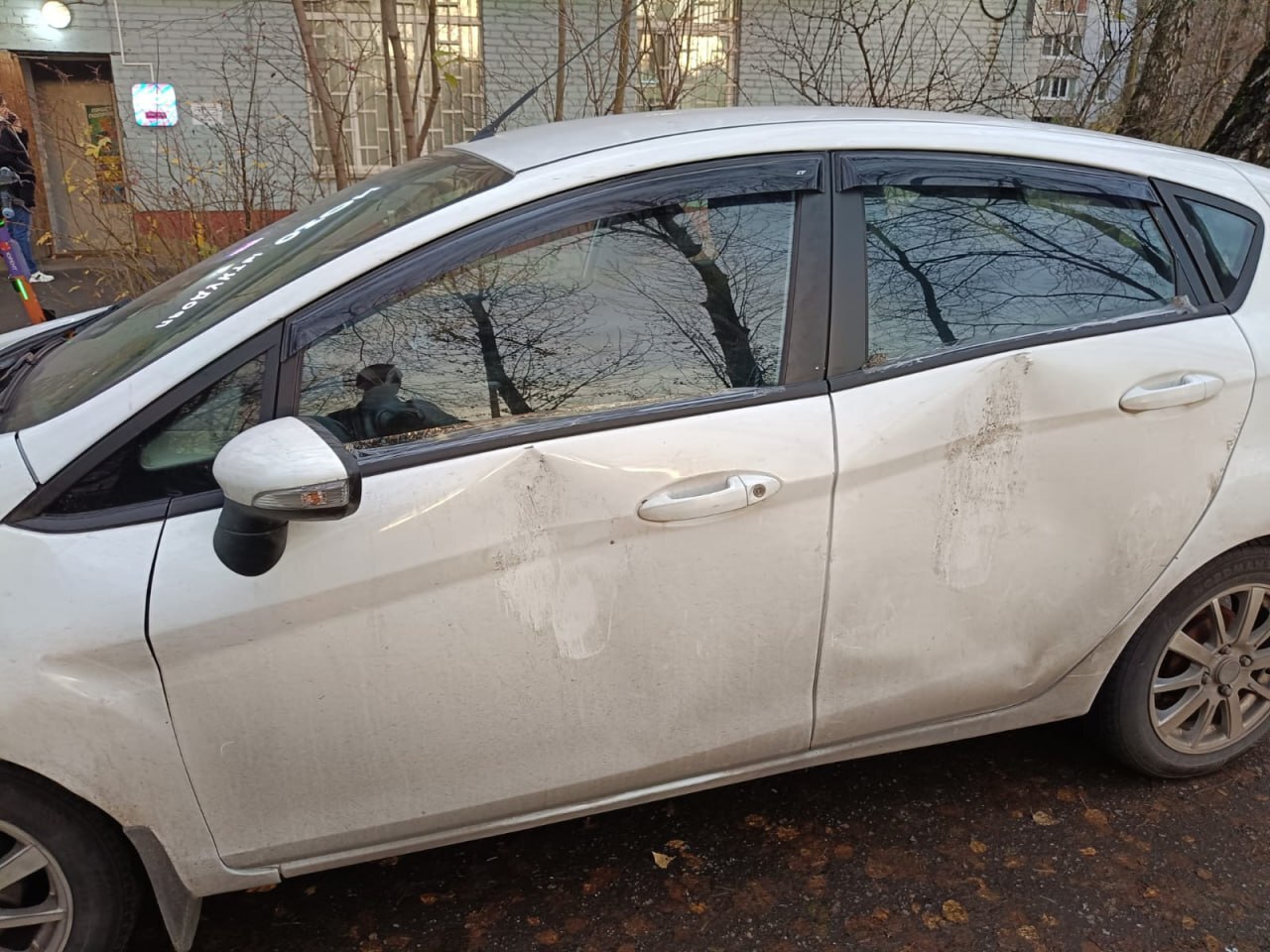 Позвонил по номеру телефона под лобовым стеклом, пообщался с владелицей фиесты и выяснилось, что в соседнем подъезде живет психбольной, которого не так давно выпустили из спец учреждения и который словил обострение. Нашел камеру, запросил доступ к ней и после некоторого времени просмотра архивов нашел момент как бьют мою машину. (для тех кто будет говорить, что машина стоит на тротуаре поясню: Тротуар там заканчивается сразу под порогом машины)