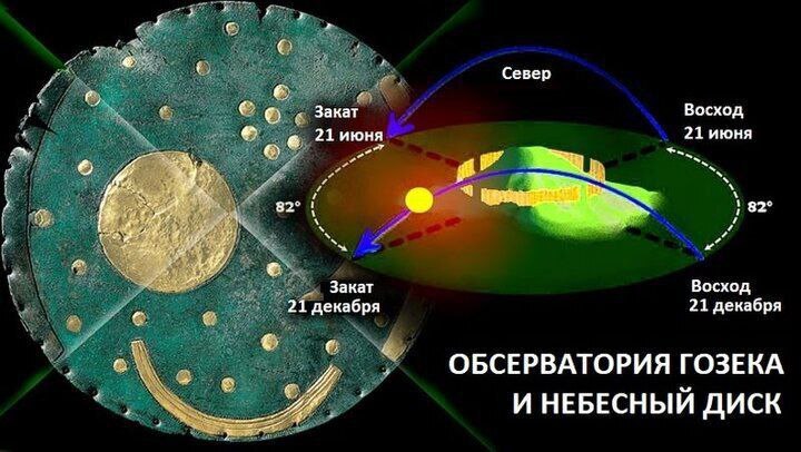 В 25 километрах к юго-востоку от Небры на пшеничном поле около поселка Гозек археологи в 2003 году раскопали огромную доисторическую солнечную обсерваторию. Это земляное сооружение представляло собой площадку диаметром 75 метров, где располагались два деревянных ограждения круглой формы. В трех местах в ограждениях были сделаны проходы – ворота к солнцу. 21 декабря, в день зимнего солнцестояния, внутри сооружения можно было наблюдать причудливую игру солнечного света. На восходе солнечный свет попадал точно в восточные ворота, а на закате солнца – непосредственно в ворота западные. По мнению исследователей, между небесным диском из Небры и обсерваторией вблизи Гозека имеется несомненная связь. Профессор Вольфгард Шлоссер из университета в городе Бохум исследовал небесный диск с астрономической точки зрения. Он убежден: тот, кто создал этот диск, намеренно обозначил положение семи звезд из состава Плеяд, а остальные звезды расположил на диске, чтобы просто представить на нем звездное небо. А вот изображение на диске Плеяд наряду с Солнцем и Луной имеет глубокий смысл.