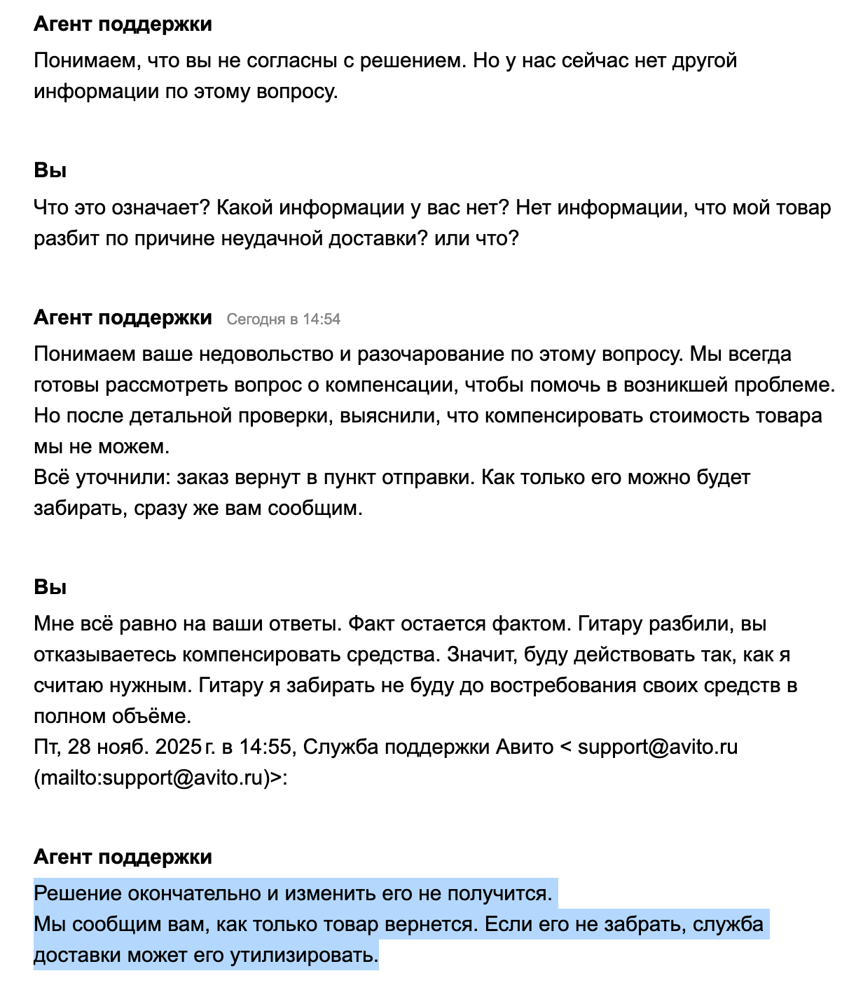 Обращаюсь ко всем продавцам: будьте внимательны! Эта ситуация явно показывает, как бы Авито не гарантировал сохранность ваших товаров, мало того, что они не страхуют их, так и в случае повреждения будут кормить вас отписками, с наплевательским отношением, чтобы не выплачивать компенсацию. Сегодня 28.11.2025 уже отправлена досудебная претензия. Жду как будет развиваться ситуация, далее - в суд и Роспотребнадзор.