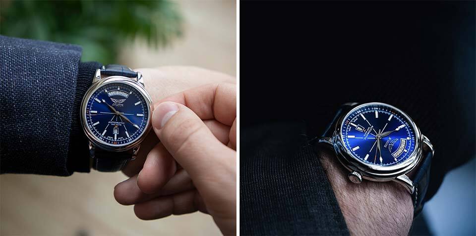 Эта швейцарская компания – на данный момент, возможно, единственная в мире, выпускающая исключительно часы в пилотском стиле. Ну да, название обязывает... Интересный факт: лаборатория Aviator находится в бывшей контрольной вышке действующего аэродрома. Из продукции компании отметим трехстрелочники (без даты – ее, возможно, с основанием, сочли лишней) Vintage Douglas Dacota, названные именем культового самолета. Все признаки стиля налицо: сатинированная (т.е. не бликующая) сталь, диаметр 45 мм, водостойкость 10 атмосфер (100 м), сапфировое стекло с антибликовым покрытием, контрастный циферблат с люминесцентными кафедральными стрелками и арабскими цифрами, большая заводная головка с рифлением, кожаный ремешок с раскладывающейся застежкой. Испытанный, надежный автоматический калибр Sellita SW200 снабжен противоударной системой Incabloc и особым регулятором Etachron, обеспечивающим повышенную точность хода. Плюс декоративные элементы: например, исполнение ротора в виде авиационного триммера. Предлагается ряд цветовых решений.