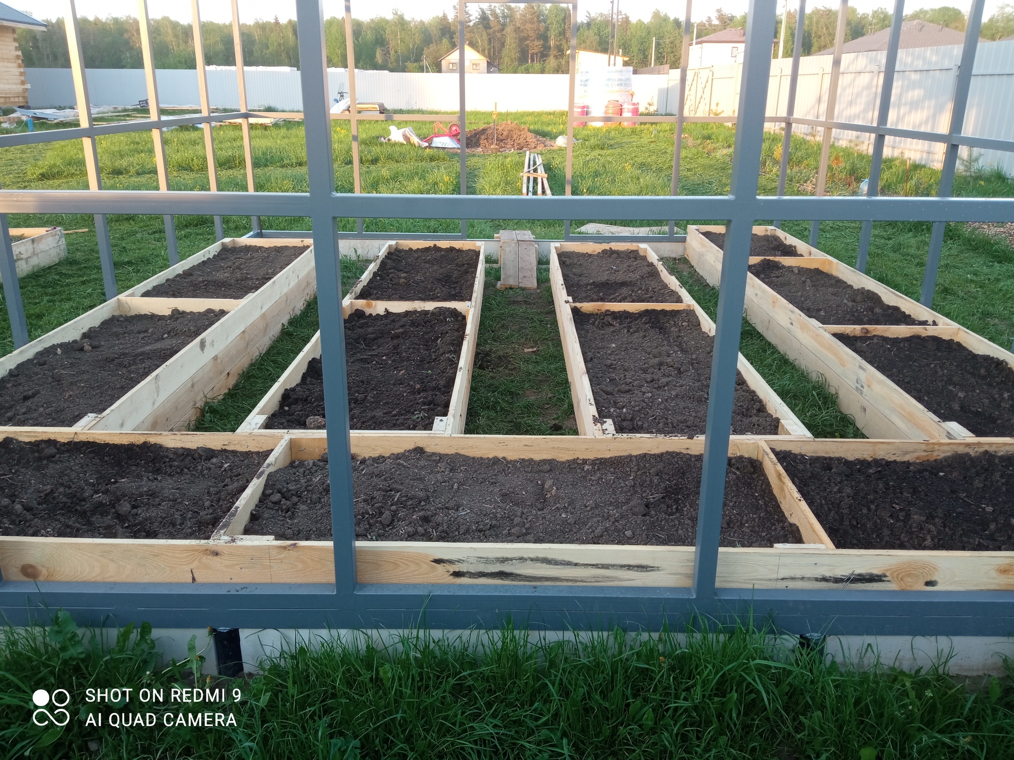 Растояние между обвязкой и землей зашивал непоплексом 50 мм. Уже не успевал залить ленту. Грядки собраны из дерева. Когда сгниют лет через 6 . Сделаю нормальные и доделаю ленту). Сезон уже был на носу по посадкам.