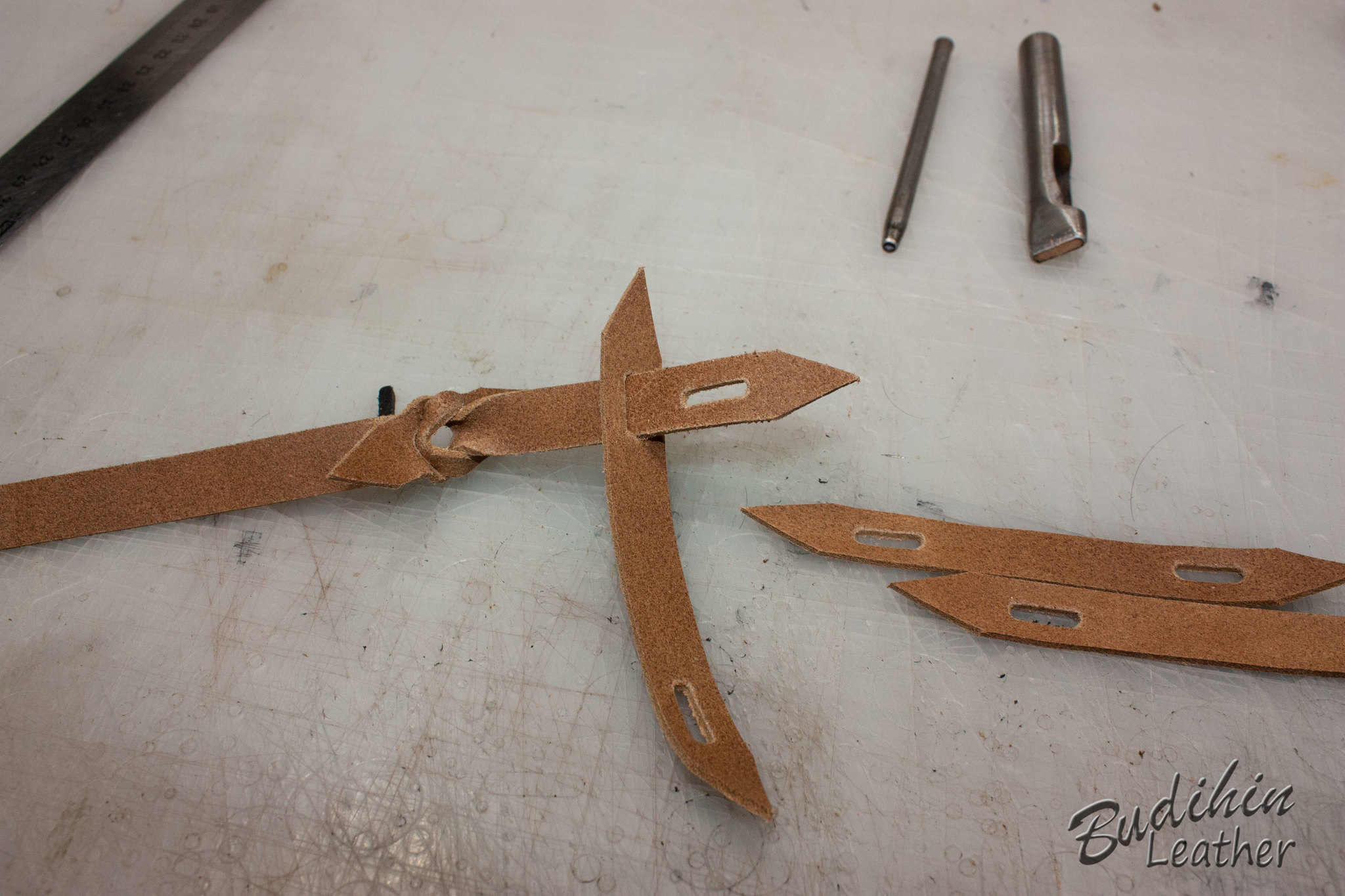 Отверстия для сборки я делаю овальным пробойником, если его нет, то вполне подойдет обычный круглый, делаем два отверстия и потом прорезаем кожу между ними. Как рассчитать диаметр пробойника и длину прорези есть у меня в более ранних МК.